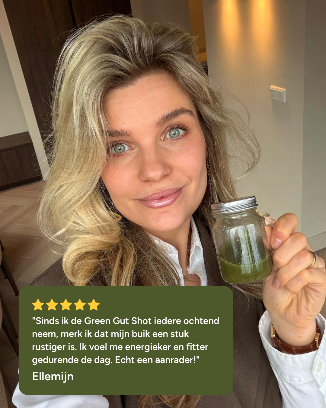 Met 15 bacteriestammen (11,5 miljard CFU per shot), plantaardige eiwitten en vezelrijke superfoods is de Green Gut Shot ontworpen om het lichaam dagelijks te voeden en te ondersteunen als onderdeel van een gezonde leefstijl. Met ingrediënten als appel, banaan, gerstegras, spirulina en pepermunt vormt deze shot een natuurlijke gebalanceerde blend. Een verfrissend groene start van de dag.